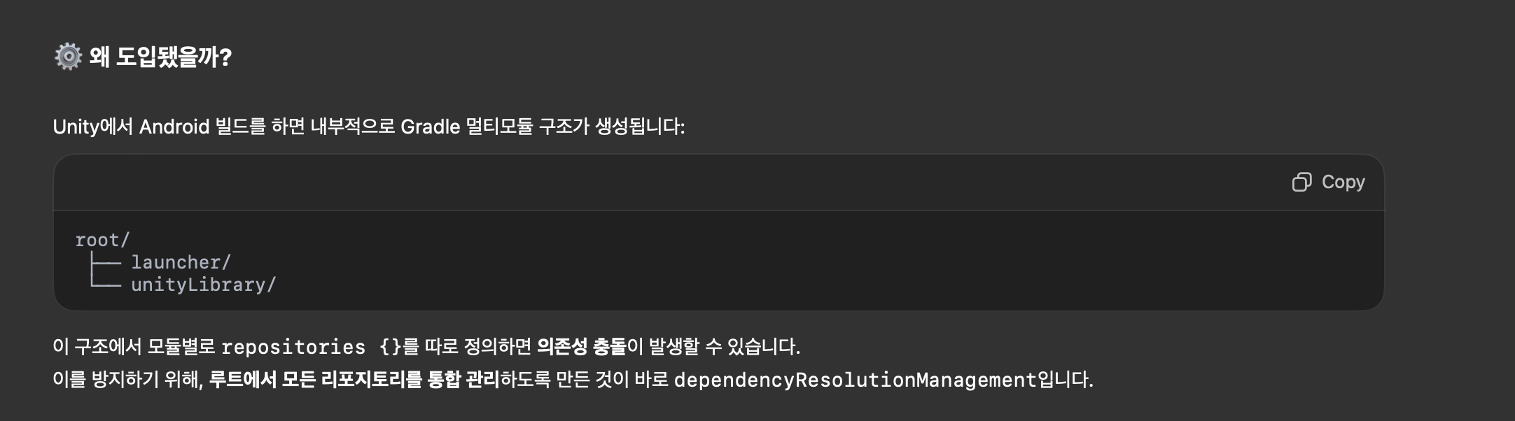 dependencyResolutionManagement๋ Unity๊ฐ Android ๋น๋๋ฅผ ๋ณด๋ค ์์ ์ ์ผ๋ก ๋ง๋ค๊ธฐ ์ํด ๋์ ํ ์ค์ ์ ๋๋ค.